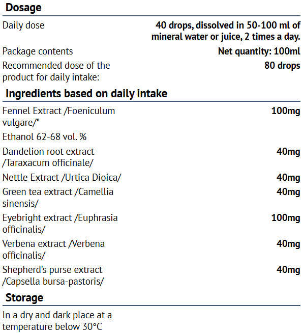 Начин на приемане: По 40 капки 2 пъти дневно, разтворени в 50 мл вода или сок