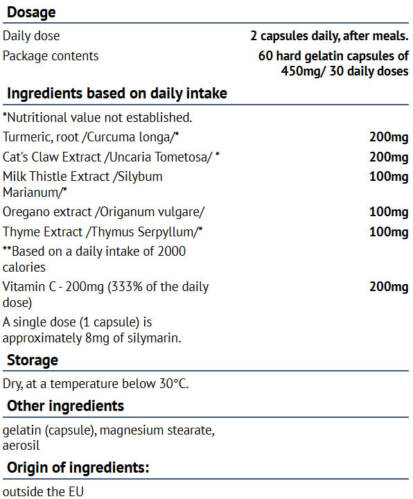 Съставки: Куркума (корен), екстракт от котешки нокът, екстракт от бял трън, екстракт от риган, екстракт от мащерка, витамин C