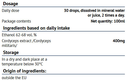 Съставки: Екстракт от кордицепс, етанол 62–68%