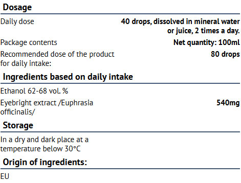 Съставки: Екстракт от очанка (Euphrasia officinalis), етанол (62–68% об.)