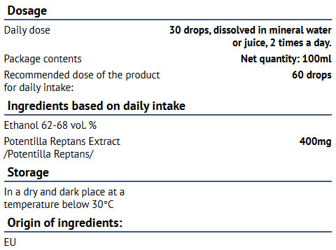 Съставки: Екстракт от петопръстник (Potentilla reptans), етанол (62–68% об.)