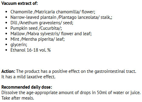 Съставки: Екстракти от лайка, живовляк, копър, тиквено семе, слез, мента; глицерин, етанол (16–18% об.)
