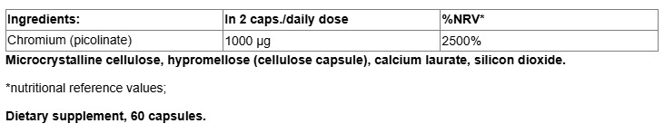 Хром пиколинат е биодостъпна форма на хром – минерал, който участва в транспорта на глюкозата в клетките и регулира действието на инсулина. Той подпомага разграждането на въглехидрати, мазнини и протеини, насърчава стабилни нива на кръвна захар и намалява желанието за захарни храни. По този начин хромът спомага за поддържане на енергийния баланс и улеснява контрола върху теглото при здравословен хранителен режим.
