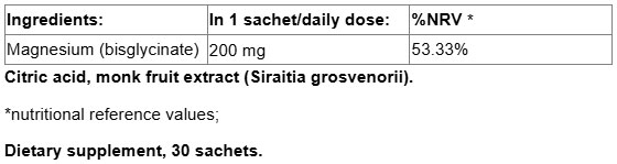 Съставки: Магнезий (бисглицинат), лимонена киселина, концентрат от плод на монашески плод (Siraitia grosvenorii)