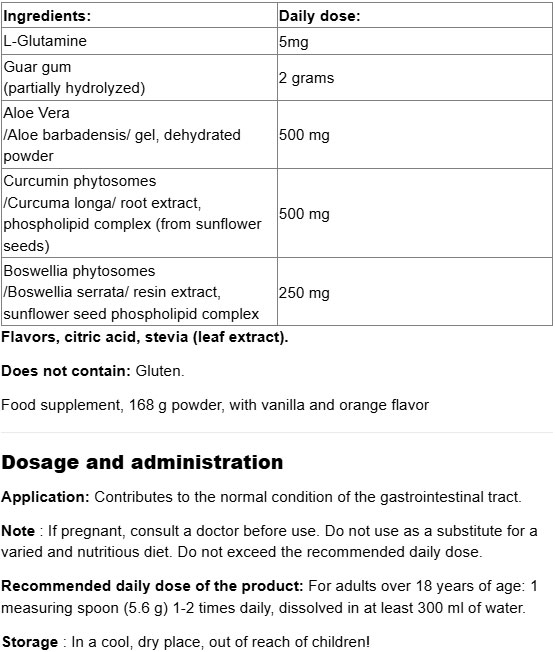 Съставки: L-Глутамин, Гуарова гума, Алое Вера, Куркумин фитосоми, Босвелия фитосоми