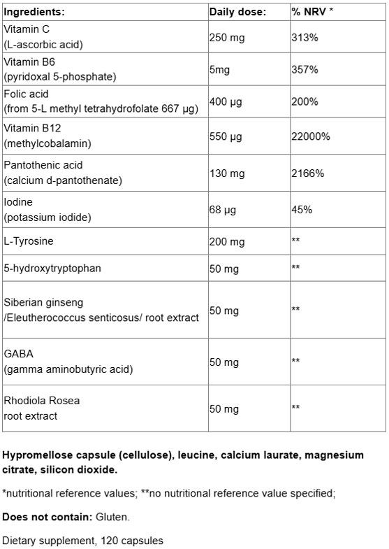 Съставки: витамини C, B6, B12, фолат, пантотенова киселина, йод, L-тирозин, 5-HTP, сибирски женшен, GABA, родиола