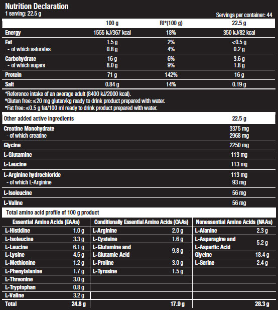 Съставки: Суроватъчен протеин, креатин монохидрат, глицин, L-глутамин, L-левцин, L-аргинин, L-изолевцин, L-валин