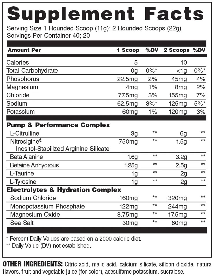 Съставки: L-цитрулин, аргинин силикат (Nitrosigine®), бета-аланин, бетаин, таурин, тирозин, натрий, калий, магнезий, морска сол