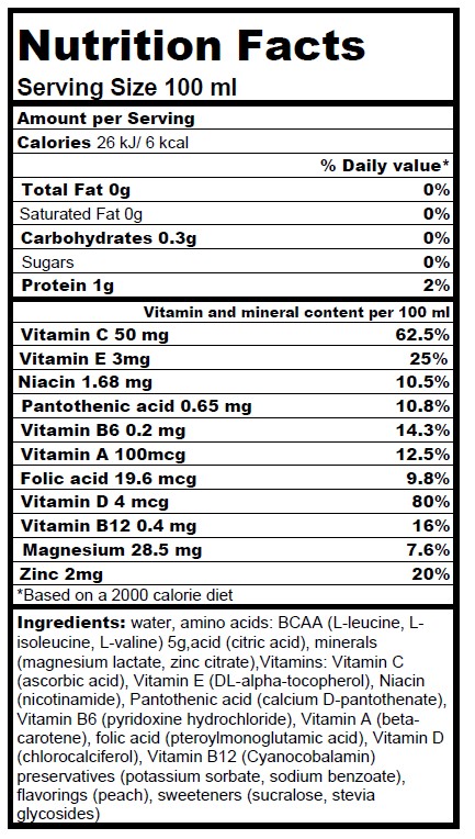 Съставки: Вода, BCAA (левцин, изолевцин, валин), витамини (C, E, B3, B5, B6, A, B9, D, B12), магнезий, цинк