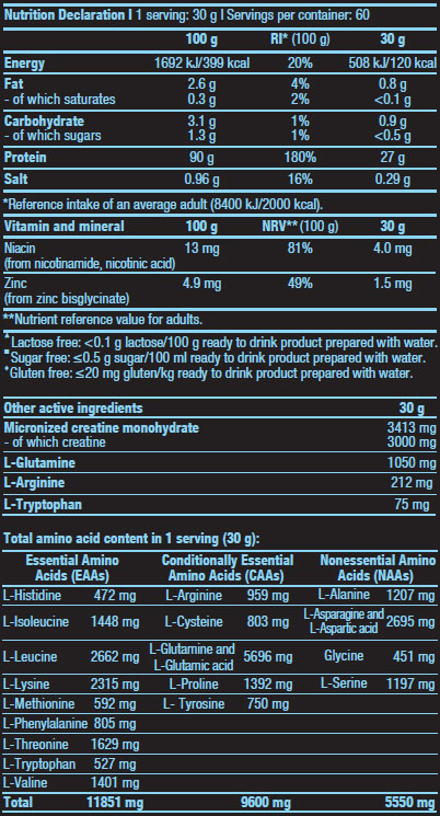 ванилия: суроватъчен протеин изолат 77% [суроватъчен протеин изолат, емулгатор: лецитини (соя)], микронизиран креатин монохидрат 11,4%, L-глутамин, ароматизанти, сметана [частично хидрогенирана кокосова мазнина, обезмаслено мляко на прах, емулгатори (E471, E472a), глюкозен сироп, захароза, млечен протеин, стабилизатор (потасиумфосфати), средство против слепване (калциеви фосфати)], L-аргинин алфа-кетоглутарат, емулгатор: лецитини (соя), сгъстители (карагенан, ксантанова смола), сол, против слепване агент (силициев диоксид), L-триптофан, подсладител (сукралоза), цинкбисглицинат, никотинамид, никотинова киселина, оцветител (тартразин) 4.