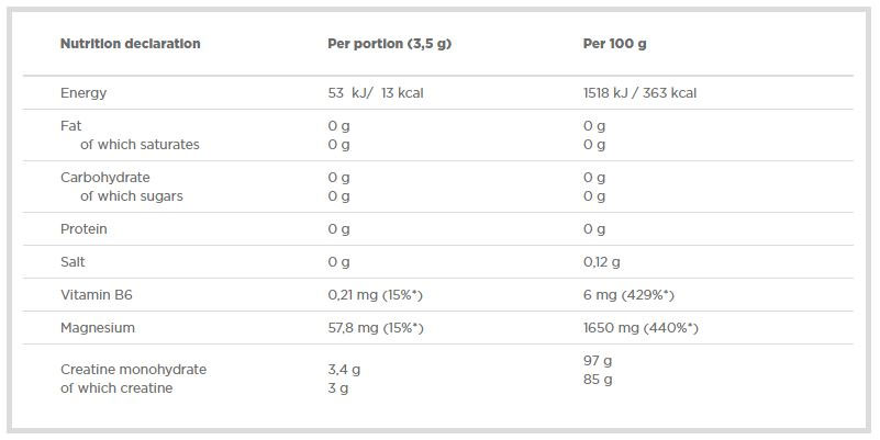 Съставки: креатин монохидрат, витамин В6, магнезий