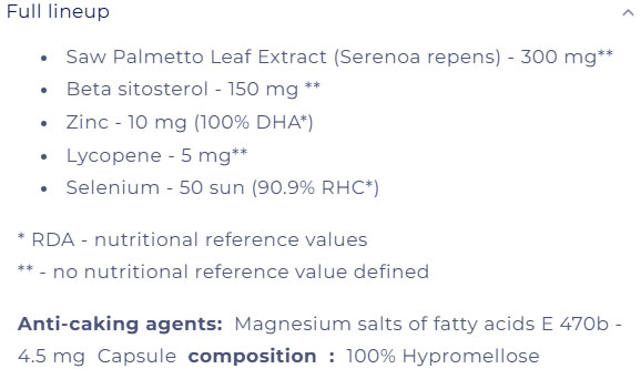 Съставки: Екстракт от Saw Palmetto, бета-ситостерол, цинк, ликопен, селен.