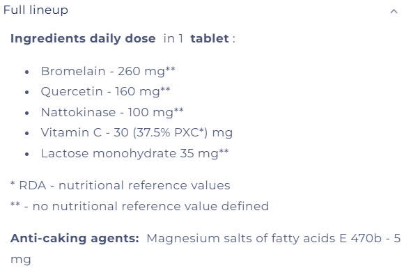 Съставки: Бромелаин, кверцетин, натокиназа, витамин C, лактоза монохидрат.