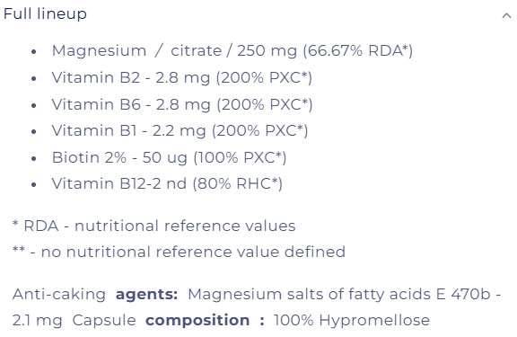 Съставки: Магнезий цитрат, витамин B2, витамин B6, витамин B1, биотин, витамин B12.