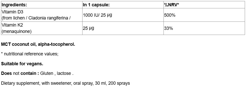 Vegan Vitamins K2 (25 µg) + D3 (1000 IU) Spray / 30 ml