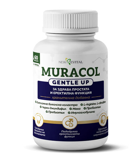 Muracol Gentle Up от New Revital е комплексна формула в капсули, създадена за поддържане здравето на простатата, еректилната функция и мъжкия фертилитет. Съчетава биволска коластра, аминокиселини, растителни екстракти и витамини, които действат синергично за подобряване на кръвообращението, имунния баланс и сексуалната активност.