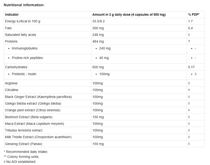 Биволска коластра (имуноглобулини, пролин пептиди, растежни фактори, лактоферин, лактопероксидаза, лактоза); витамин D3; витамин K2; яйчен жълтък (IgY); инулин; лецитин; аргинин; цитрулин; екстракт от черен джинджифил (Kaempferia pariflora); екстракт от гинко билоба; екстракт от кора на сладък портокал (Citrus sinensis); екстракт от червено цвекло; екстракт от мака; екстракт от бабини зъби; екстракт от магарешки трън; сминдух; екстракт от женшен.