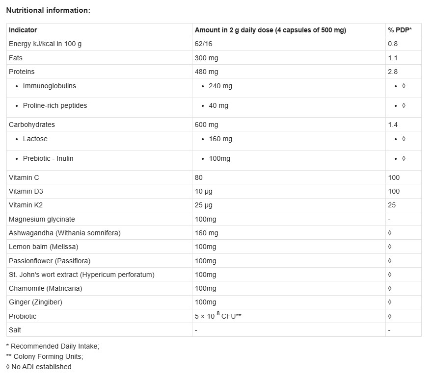 Биволска коластра (имуноглобулини, пролин пептиди, растежни фактори, лактоферин, лактопероксидаза, лактоза); фракция коластра с пролин пептиди; биоактивни компоненти от яйчен жълтък (IgY); пробиотичен комплекс (Lb. bulgaricus, Lb. acidophilus, Lb. plantarum, Lb. rhamnosus, Lb. helveticus, Lb. casei, St. thermophilus, Bif. bifidum, Bif. longum, Bif. infantis); пребиотик инулин; витамин C; витамин D3; витамин K2; магнезиев глицинат; екстракт от ашваганда; екстракт от маточина; екстракт от пасифлора; екстракт от лайка; екстракт от джинджифил; екстракт от жълт кантарион.