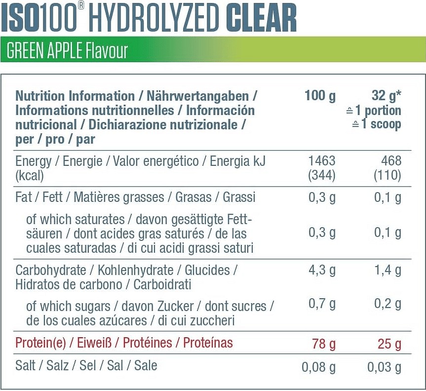 ISO 100 Hydrolyzed Clear е изключително чист и лесен за смесване, без неприятни остатъци и бучки. Съдържащ 25 гр. висококачествен протеин на порция, тази добавка ще задоволи нуждите на всеки активен човек, без да натоварва организма с излишни калории от захар и мазнини.