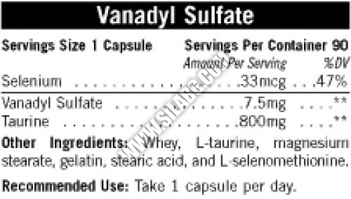 UNIVERSAL Vanadyl Sulfate участва в редица метаболитни процеси в организма и се предпочита от атлетите най-вече заради действието си да уголемява мускулните клетки. Включен е в този продукт, защото има свойството да засилва ефекта на инсулина и по този начин намалява резистентността ни към него. Също така, предпазва органите и най-вече черния дроб от влиянието на токсичните вещества, каквото може да бъде ванадил сулфатът, ако се приема във високи дози.