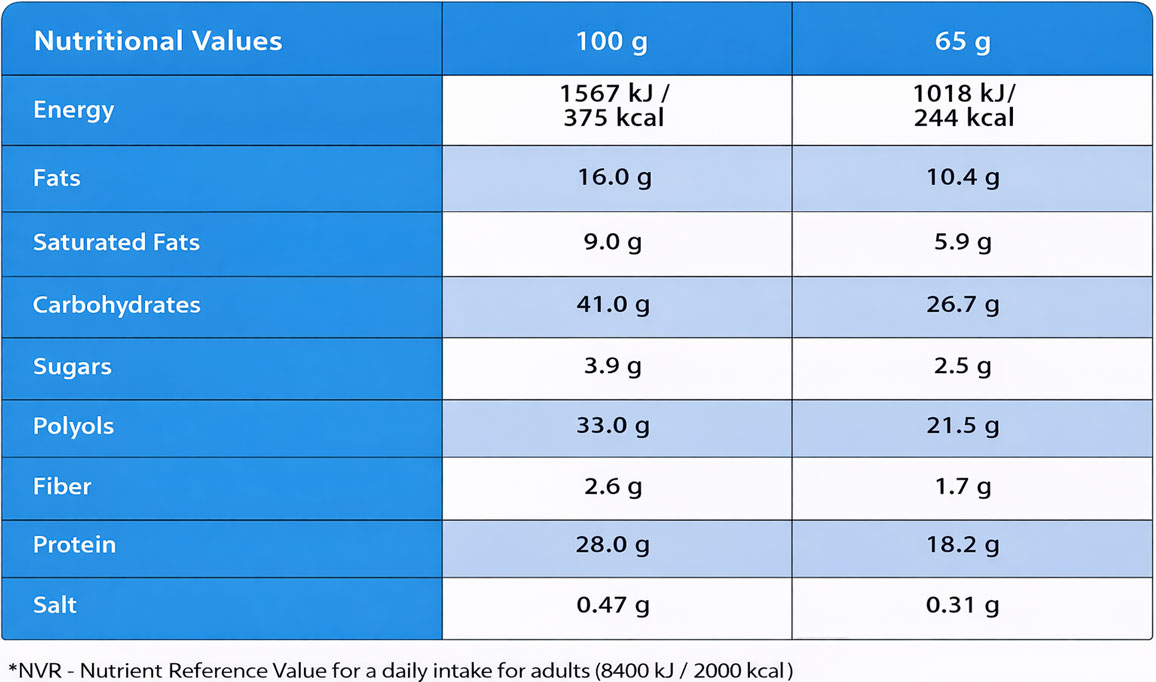 Основата на продукта е протеинов бленд, който включва млечен протеин, говежди колаген и соев протеин. Млечният протеин осигурява пълноценен аминокиселинен профил и допринася за поддържането на мускулната маса. Говеждият колаген допълва протеиновия състав и участва в поддържането на съединителната тъкан. Соевият протеин добавя растителен източник на белтъчини и допринася за общото протеиново съдържание на бара. Комбинацията от тези три източника осигурява балансиран прием на протеин в удобна форма.