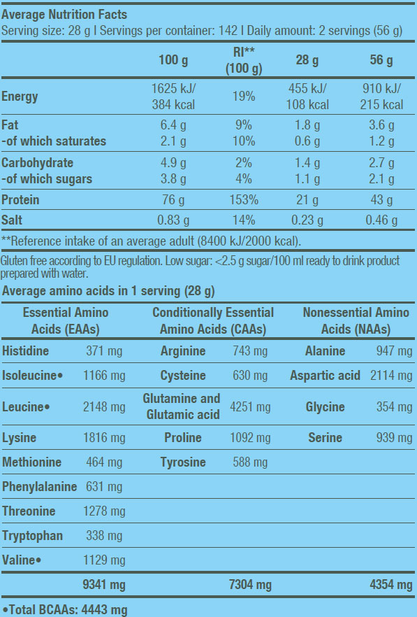 Доста добро съдържание на белъчини. Лъжичката е 28 грама, а чистия протеин е 22 грама, което го прави доста високо съдържание на белтъчини за протеин концентрат.
