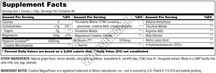 Съставки: магнезий креатин хелат, дикреатин малат, трикреатин матрица
