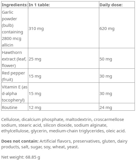 Съставки: Чесън на прах (луковица), калций, рутин, лют червен пипер, витамин Е