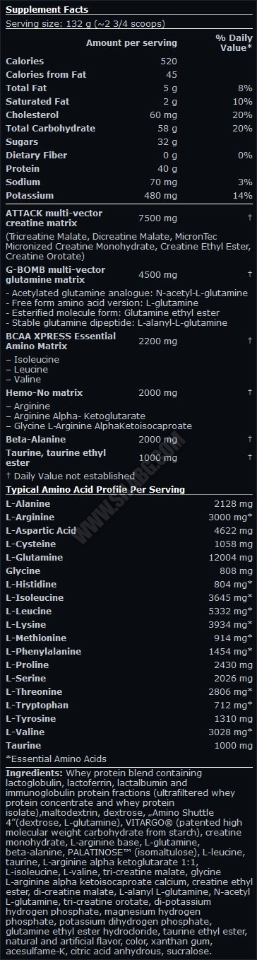 MYOMAX™ Professional съдържа 40 гр най-висококачествен суроватъчен протеин изолат и концентрат (CFM®WPI) и двата с изключително високо съдържание на протеинови микрофракции. Допълнително са добавени 9 гр аминокиселини, с което общото съдържание на протеин и аминокиселини – необходими за да осигурят азот на мускулите, нараства до 49 гр. Обогатен с новата матрица аминокиселини BCAA XPRESS, MYOMAX™ Professional съдържа повече от 12 гр ВСАА в доза, а за тях се знае, че движат протеиновия синтез и освен това са първите аминокиселини, които се изразходват по време на интензивна тренировка.