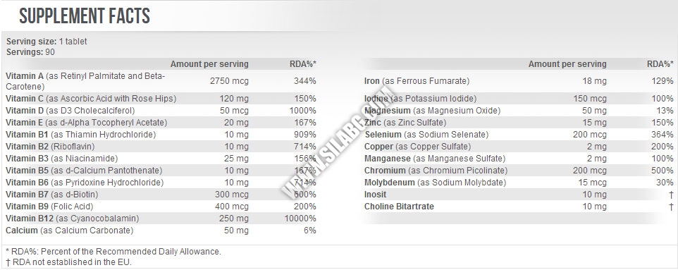 Пълноценен комплекс витамини и минерали в бета-каротен. Всяка таблетка ви доставя 28 основни хранителни вещества; витамините В-комплекс и С са представени в бавно освобождаваща активните съставки формула; плюс 13 основни минерала, включително хром, селен и цинк.
