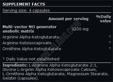 Съставки: патентована мултивекторна анаболна матрица, генерираща азотен оксид (аргинин алфа-кетоглутарат, аргинин кетоизокапроат, орнитин алфа-кетоглутарат)