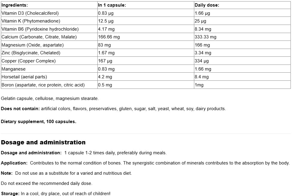 Съставки: Витамин D3, Витамин К, калций, магнезий, цинк, мед