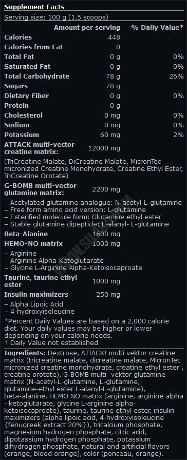 Съставки: декстроза, мултивекторна креатинова матрица ATTACK! (Три – Креатин малат, Ди – Креатин малат, MicronTec – микронизиран креатин монохидрат, Креатин етил етер, Три – Креатин Оротат) , мултивекторна G-BOMB глутаминова матрица (Н – Ацетил Л – Глутамин, Л – Глутамин, Глутамин етил естер, Л – Аланил Л – Глутамин ), Бета – аланин, Матрица HEMO-NO (аргинин, аргинин алфа кетоглутарат, Глицин Л – Аргинин Алфа – кетоизокапроат) , таурин, таурин етил естер, инсулинови стимуланти (Алфа липоева киселина, 4 - хидрокси изолеуцин {20% екстракт от тилчец}), три – калциев фосфат, магнезиев хидроген фосфат, лимонена киселина, ди – калиев хидроген фосфат, калиев ди – хидроген фосфат, естествени и изкуствени овкусители (портокал, червен портокал), цвят (червен, оранжев) .