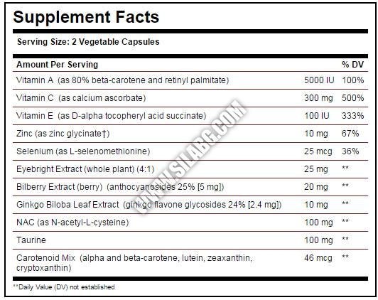 Съставки: Витамин С (калциев аскорбат), Н-ацетил-л-цистеин (NAC), Таурин, Витамин Е ( 100 IU d–алфа токоферил сукцинат), Цинк, Натурален бета каротин (съдържа соя), Осигуряващ други каротеноиди , Екстракт на прах от Eyebright (euphrasia parthenium) (4:1), Екстракт на прах от боровинки (vaccinium myrtillus (5мг [25%] антоцианозиди), Екстракт на прах от листа от гинкго билоба (2,4мг [24%] гинкго флафонови гликозиди), Селен, Витамин А (1000 IU, палмитат)