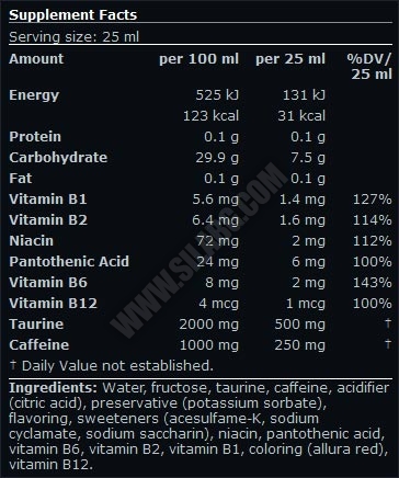 Съставки: витамин В1, витамин В2, витамин В6, витамин В12, таурин, кофеин, ниацин