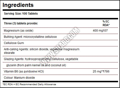 Съставки: Магнезий ( магнезиев оксид ), Витамин В6 ( пиридоксин хидрохлорид )