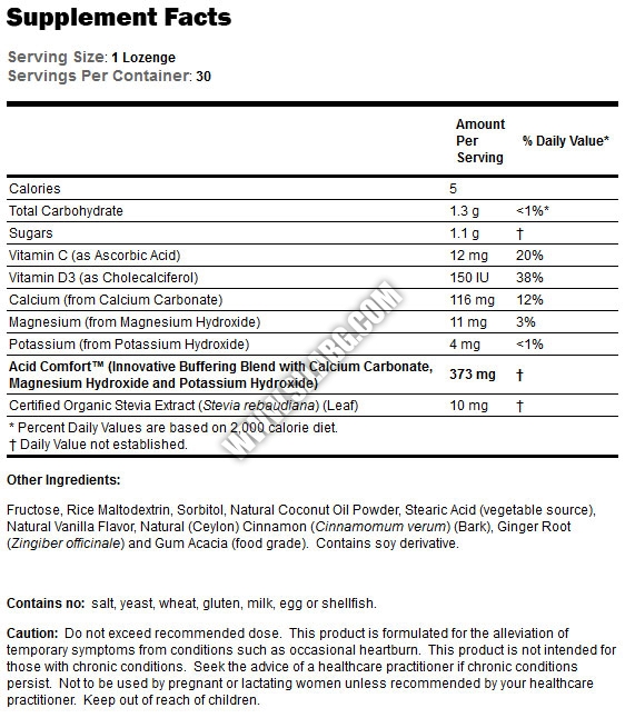 NOW Acid Comfort ™ е изцяло естествена диетична добавка, несъдържаща никакви изкуствени есенции и оцветители.