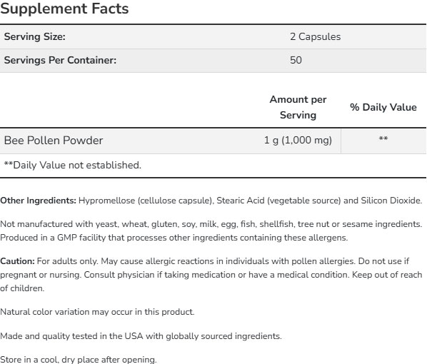 NOW Bee Pollen предоставя всички естествени хранителни вещества, като при истински здравословната храна. Пчелният прашец е фин прах, който представлява мъжкият елемент на цветето. Медоносните пчели, събиращи прашеца, инстинктивно вземат само чистия и здравословен прашец. След това той е смесен с цветен нектар и слюнката на пчелите, за да образува една напълно естествена, високо питателна храна, която съдържа всички двадесет и два елемента, изграждащи човешкото тяло. Доставя витамини, аминокиселини, макроелементи и ензими в една балансирана и синергична комбинация, която предоставя оптималното от биоразнообразието.