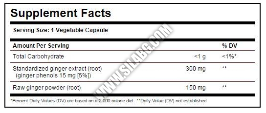 Съставки: Стандартизиран екстракт на прах от корен на джинджифил (15 mg/5 % джинджифилови феноли), Корен от джинджифил на прах