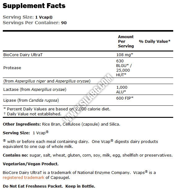 Като диетична добавка, взимайте 1 Vcapс или преди всяко ядене, което съдържа млечни продукти. Една Vcap преработва млечни продукти, равняващи се на чаша необезмаслено мляко.