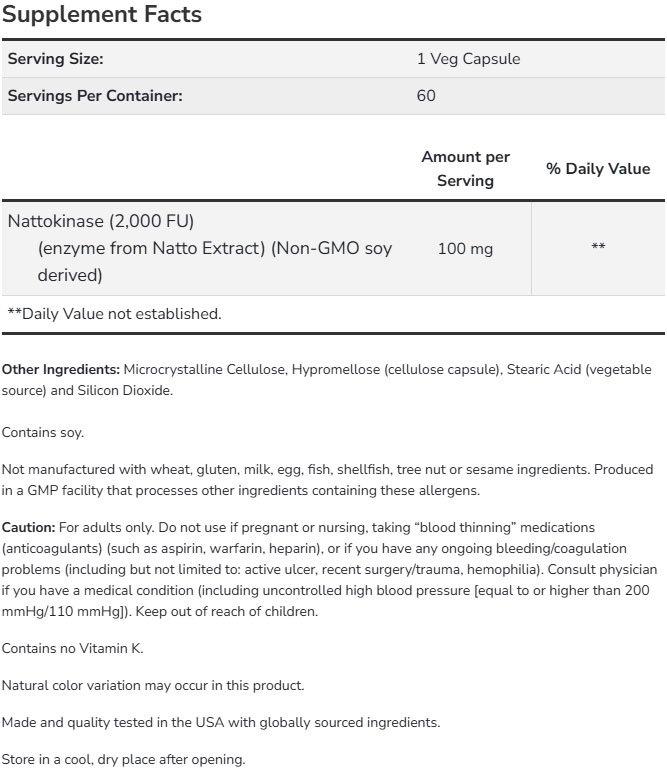 Всяка капсула NOW Nattokinase осигурява 2000 FU (Fibrinolytic Units) от ценния ензим, като намалява риска от запушване на кръвоносните съдове и осигурява здравословна подкрепа за сърцето.