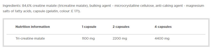 Съставки: Трикреатин малат, микрокристална целулоза, магнезиеви соли на мастни киселини, желатин (капсула)