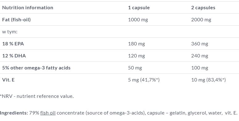 Доставя омега 3 мастни киселини, получени от рибено масло. Тяхното добавяне в диетата намалява нивото на „лошия” холестерол /LDL/ и повишава „добрия” /HDL/