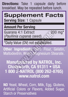NATROL Guarana съдържа екстракт от Гуарана със силно енергизиращо и тонизиращо действие, който освен това стимулира метаболизма и подпомага изгарянето намазнини по естествен и безопасен начин.