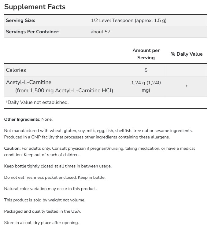 Acetyl L-Carnitine Powder има и други здравословни предимства, сред които са поддържане на сърдечното здраве, нервната система и мозъка, както и функциите му на мощен антиоксидант. С възрастта нивата на л-карнитин в организма намаляват, което налага той да се приема под формата на хранителна добавка.