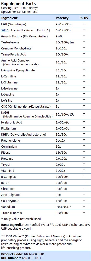 Мощна смес от HGH 9x/12c/30x, IGF-1 9x/30x, фактори на растежа 9x/9c, тестостерон 30c/100x/1M и други хомеопатични съставки: аминокиселинен комплекс, креатин монохидрат, трансферулова киселина, OKG, NADH, DHEA, хиалуронова киселина, питуитариум, прегненолон, германий, рибоза, трипсин, протеаза, витамин Е, B комплекс, бор, хром, цинков сулфат, коензим A, ванадий, остатъчни минерали, L-аргинин пироглутамат, L-карнитин, L-изолевцин, L-левцин и L-валин.