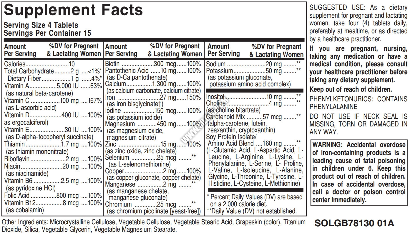 Предназначение: Подпомага оптималното функциониране на организма на жени преди забременяване, по време на бременност и кърмене. Съдържа: важни хранителни вещества; фолиева киселина; минерали; витамин В6 за подпомагане на протеиновия метаболизъм и растежа на ембриона; калций за костите и зъбите на ембриона (калциевия метаболизъм на майката се повишава през бременността); непредизвикваща запек форма на желязо; витамин D за по-добро усвояване на калций и фосфор (за здрави кости и зъби); бета каротен за развитие на тъкани, зъби и кости; витамин Е за поддържане на клетъчните стени, кръв и растеж на тъкани.