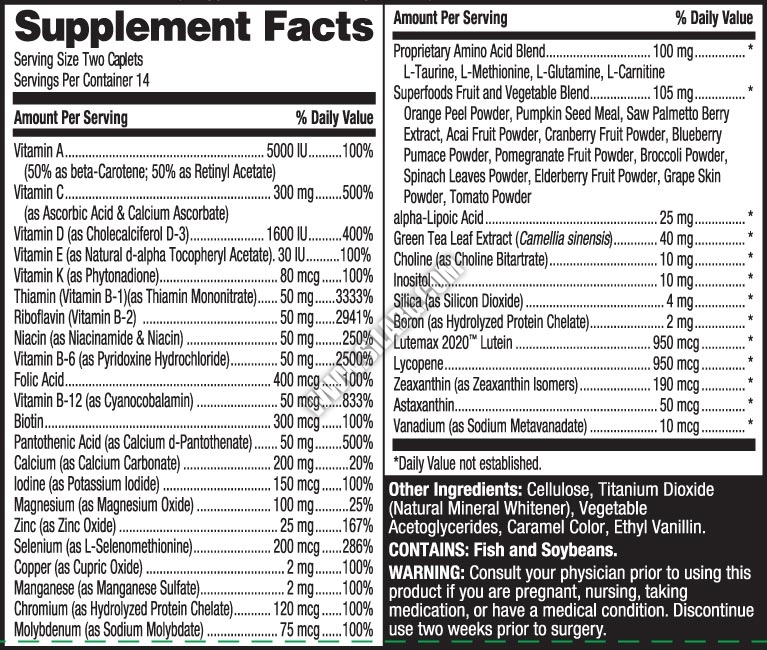 Съставки: витамин А, витамин С, витамин Е, витамин К, витамин D, тиамин, рибофлавин, витамин В6, витамин В12, фолиева киселина, калций, йод, магнезий, цинк, селен, хром, манган, астаксантин, алфа липоева киселина, борон, ликопен, холин, инозитол, зелен чай - екстракт, таурин, глутамин, л-карнитин, екстракт от червена боровинка, екстракт от броколи, спанак, акай бери