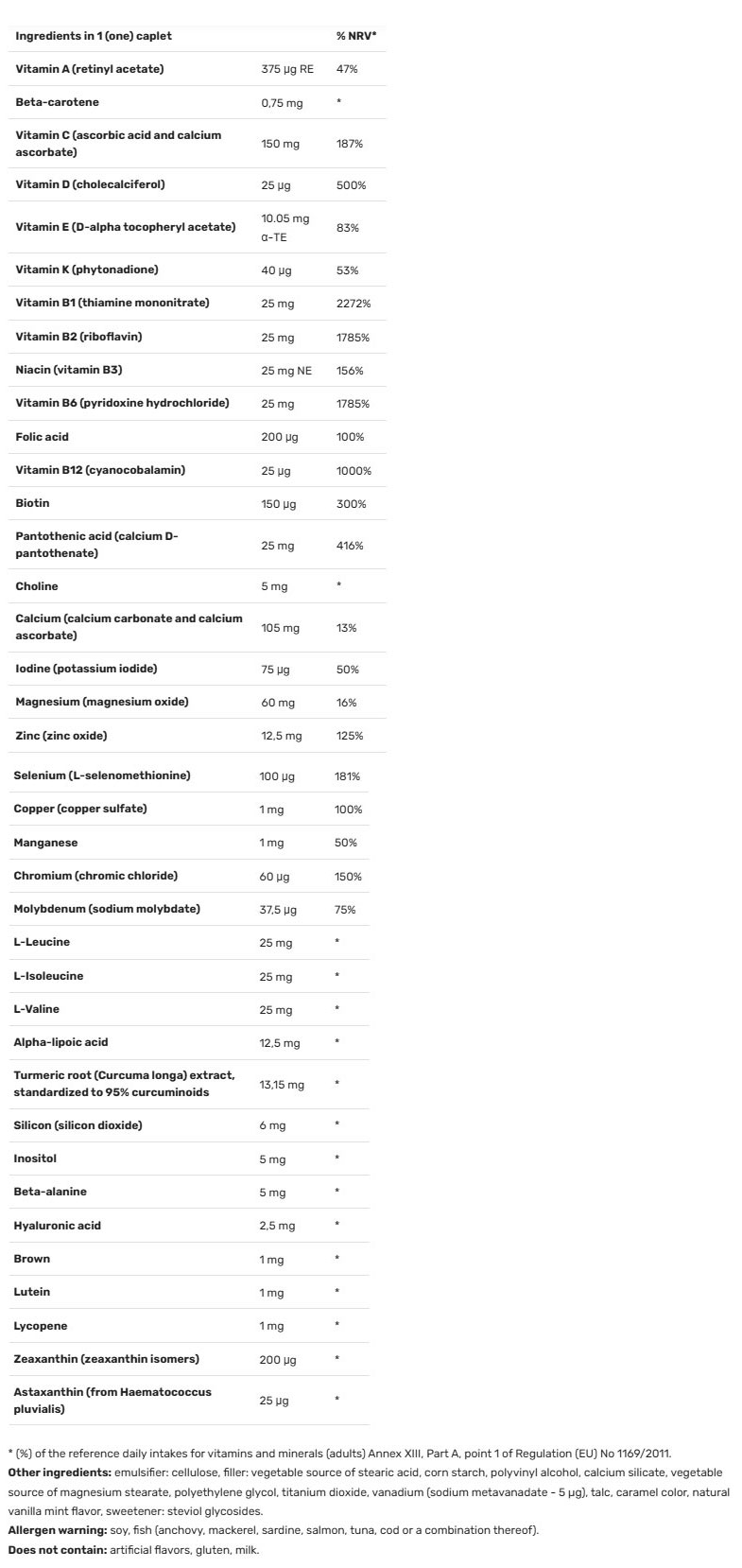 Тези витамини за мене са най-мощните и силни до момента о години ги взимам.Много съм доволен ,но трябва след месец прием да се направи почивка поне 10-15 дена.Пише че се взимат по 2 таб. за една доза(прием) но аз взимам всеки ден по 1 таб.Другото което е че самите витамини и минерали в таблетката водят до детоксикация на организма и извеждат вредните радикали извън организма.Съща така има и МСМ(метил-сулфат-метан) които подпомага възстановяването на ставите.