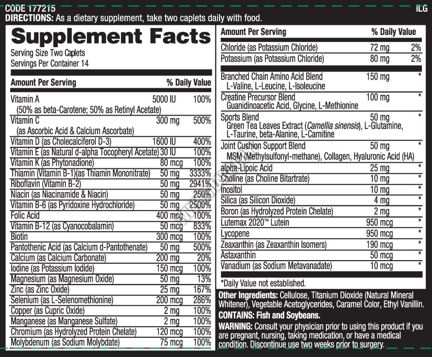 Съставки: Витамин А (50% бета-каротен, 50% ацетат), Витамин С, Витамин D (холекалциферол), Витамин Е (d-алфа токоферил ацетат), Витамин К (фитонадион), Витамин В1, Витамин В2 (рибофлавин), Ниацин (ниацинамид и ниацин, Витамин В6 (пиридоксин хидрохлорид) , Витамин В9 (фолиева киселина), Витамин В12 (цианкобаламин), Пантотенова киселина, калций, йод, магнезий, цинк, селен, мед, манган, хром, молибден, Ектракт от зелен чай, Гинко Билоба, L-аргинин, L-карнитин, L-глутамин, L-таурин), Алфа-липоева киселина, Холин (холин битартарат), инозитол, силикати, бор, лутеин, ликопен, Астаксантин, Зеаксантин